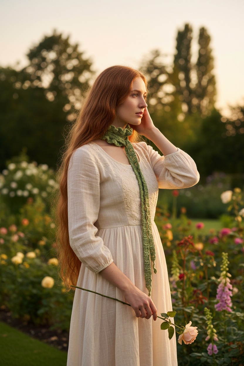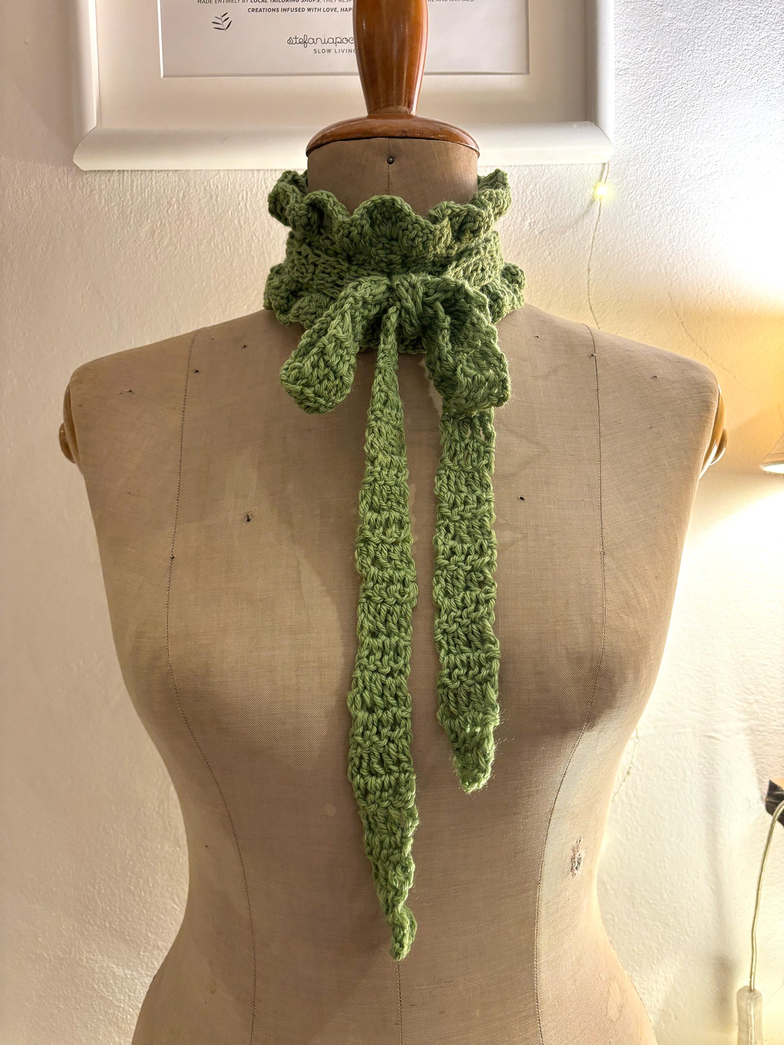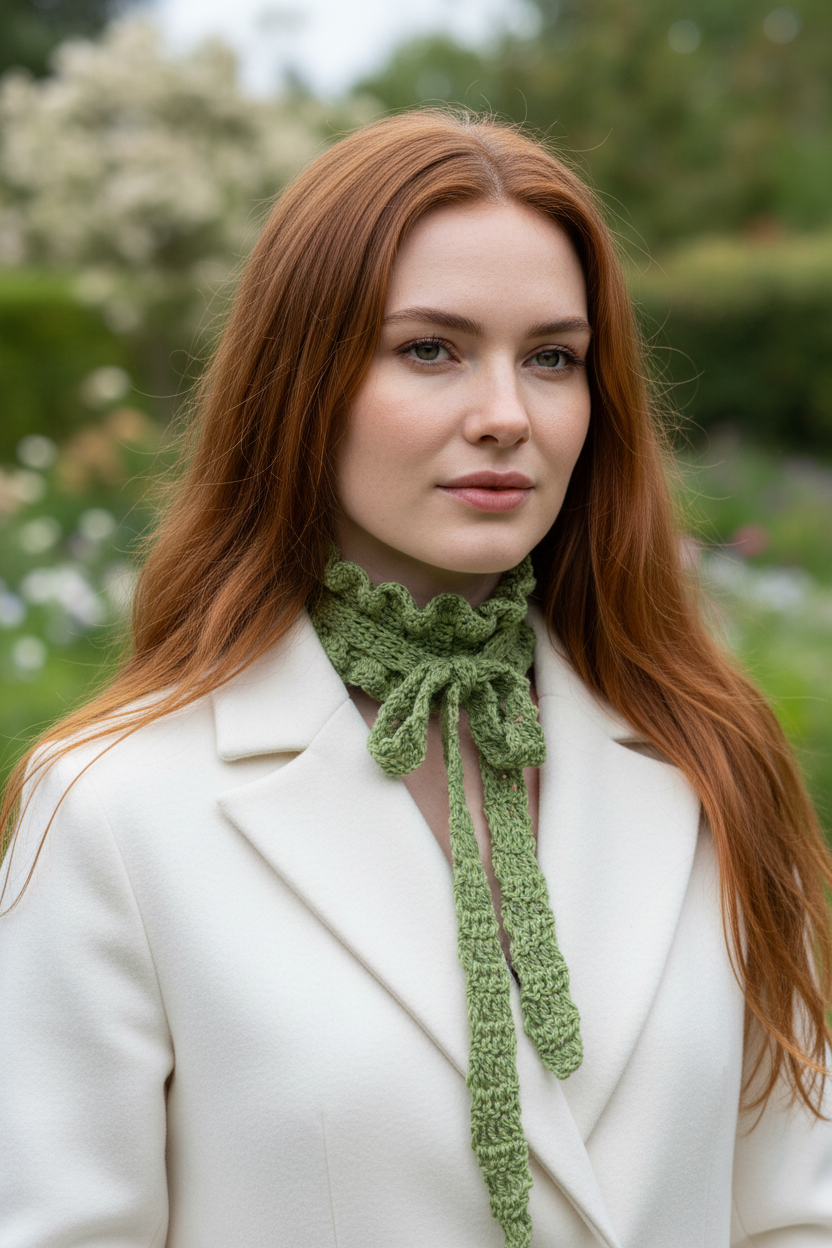 Modella con mini sciarpa Victoria volant verde salvia all'uncinetto