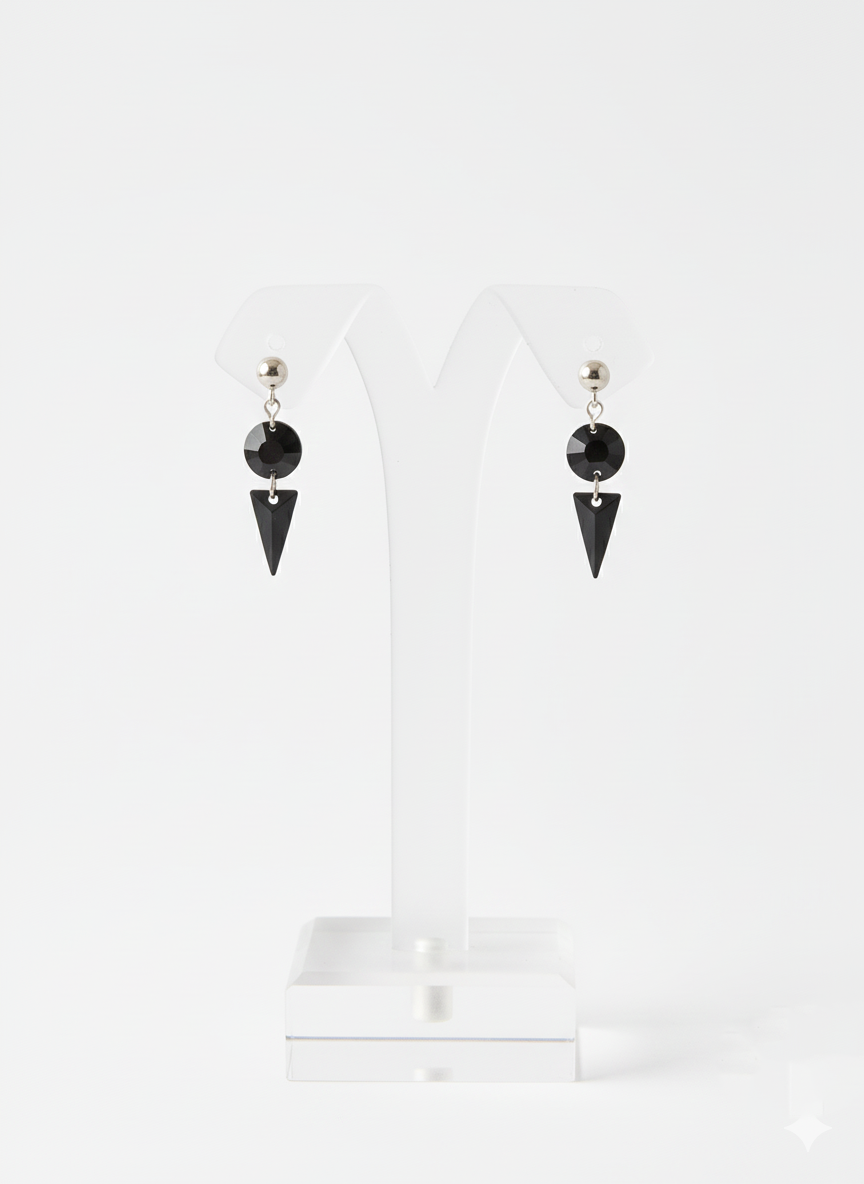 Drop earrings with a contemporary geometric design, made with faceted black crystals and black steel components. A minimal and elegant piece of jewelry that discreetly captures light, perfect for those who love a modern and refined style.