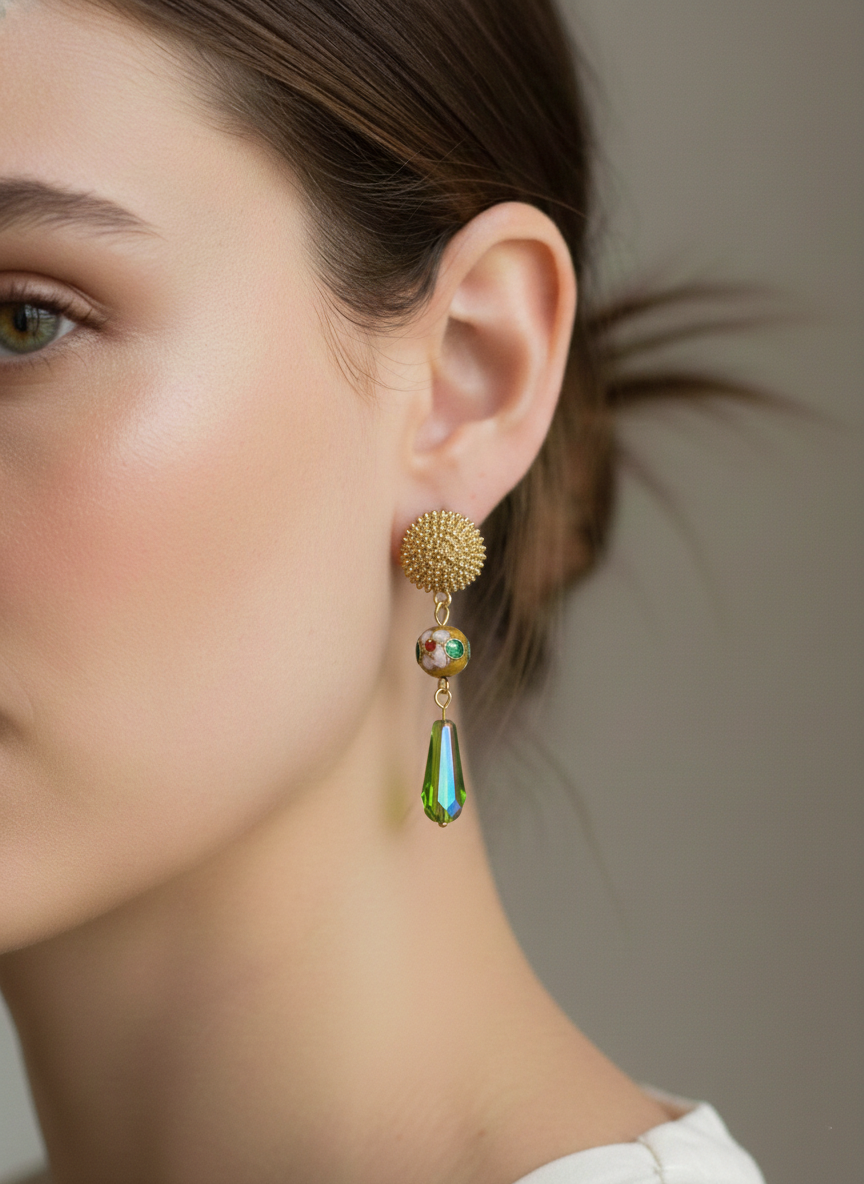 DESIGN AND MATERIALS: The design develops on three levels: a textured golden pivot that captures light, a hand-painted cloisonné pearl with floral patterns in shades of green, pink, and gold, and an elegant faceted green teardrop crystal that adds movement and brightness.