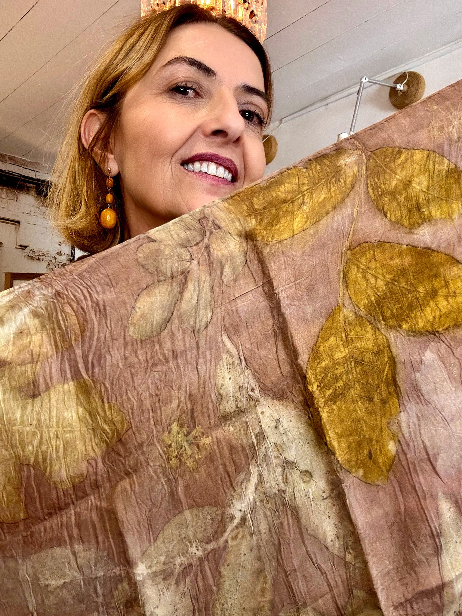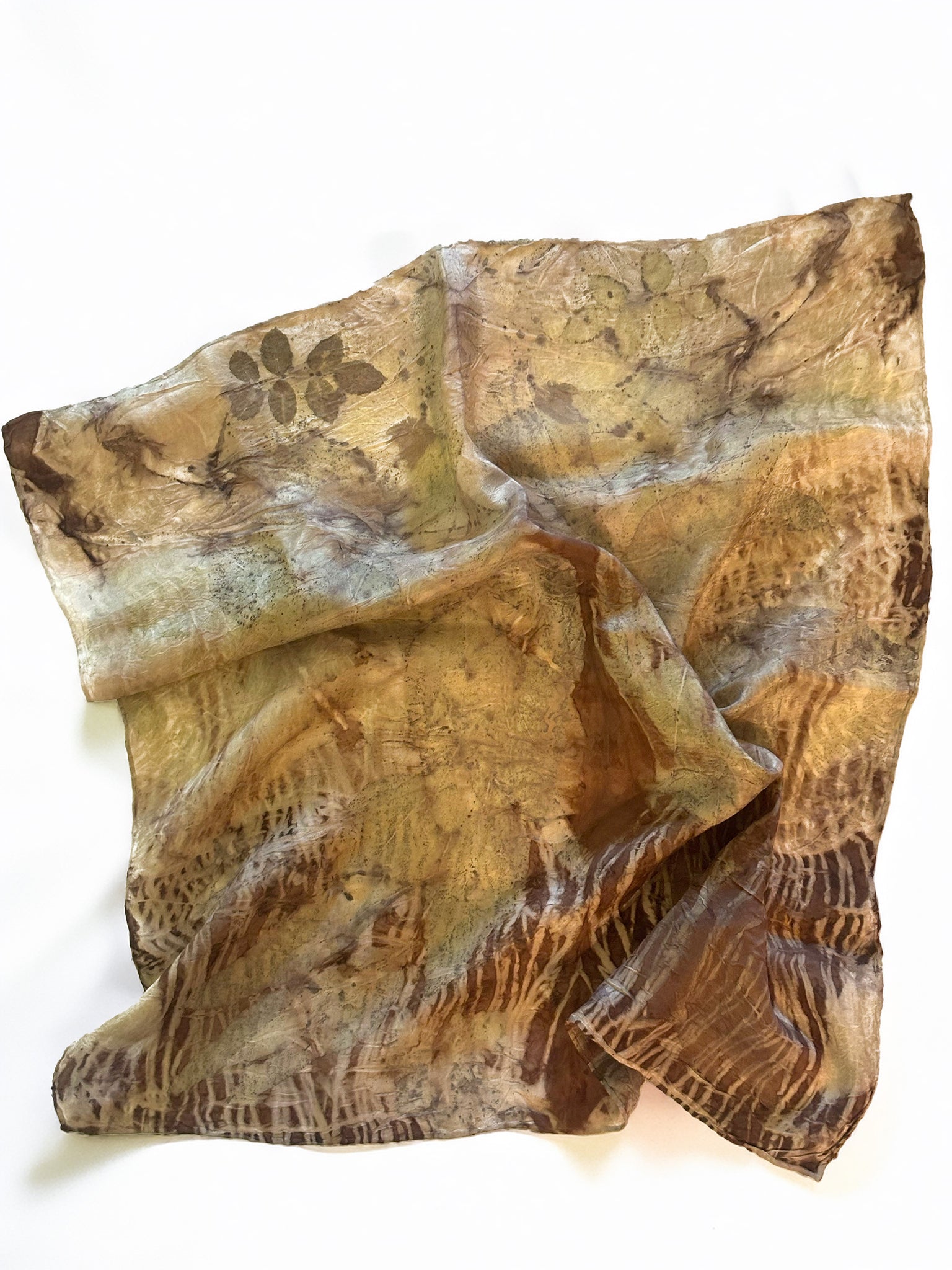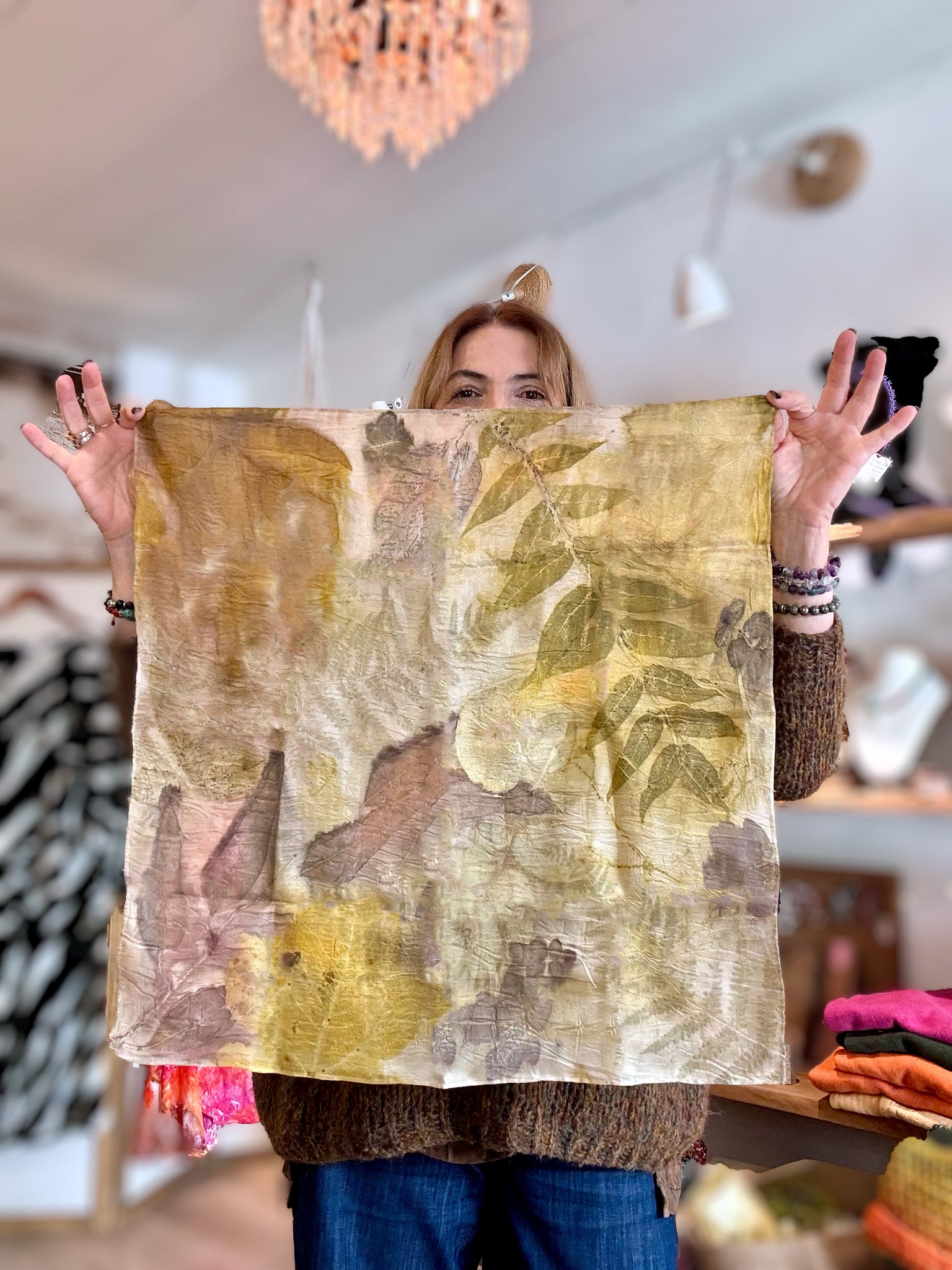 Each scarf is a small fragment of nature printed on silk using the Ecoprint technique: real leaves and flowers leave their traces in an unrepeatable design.