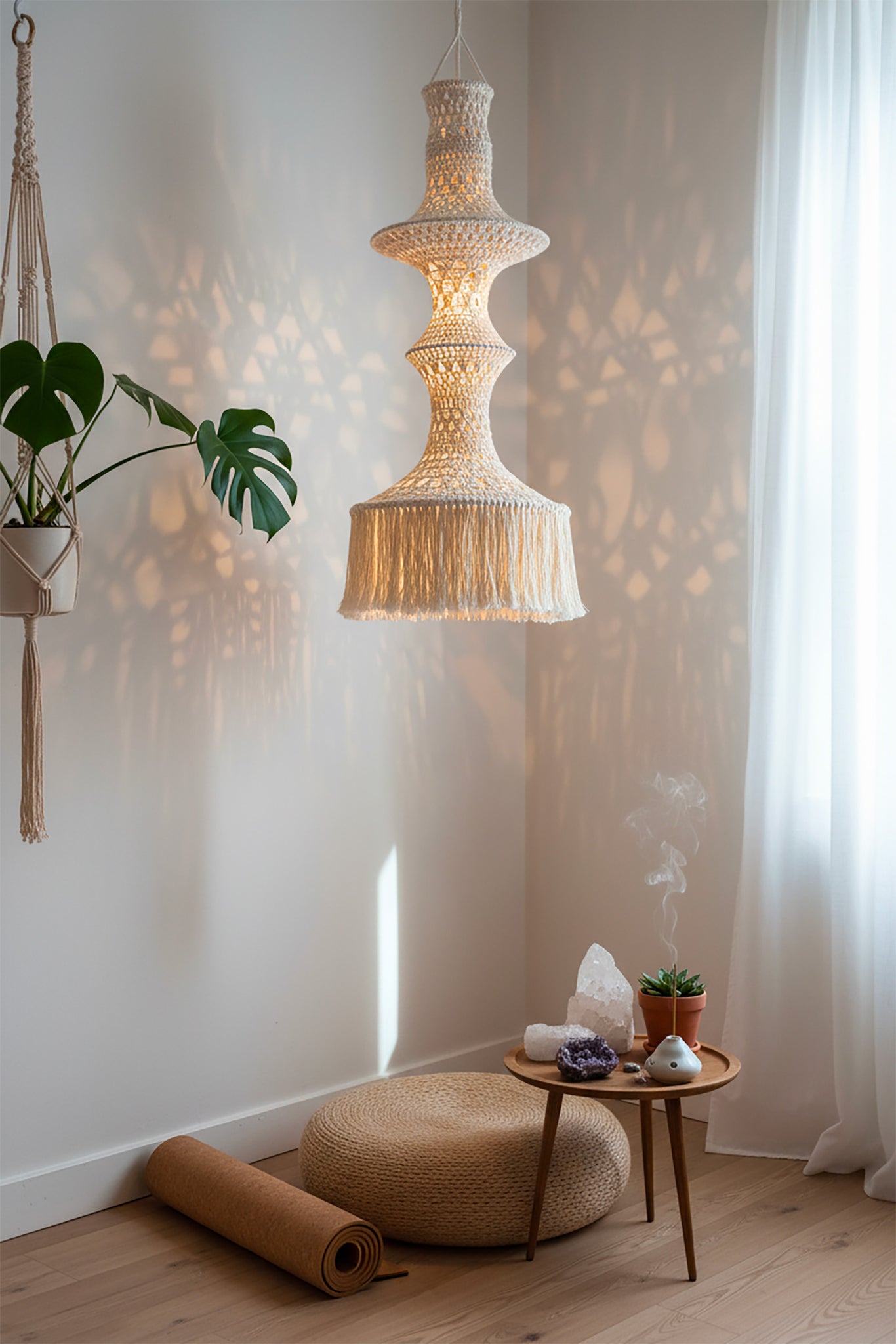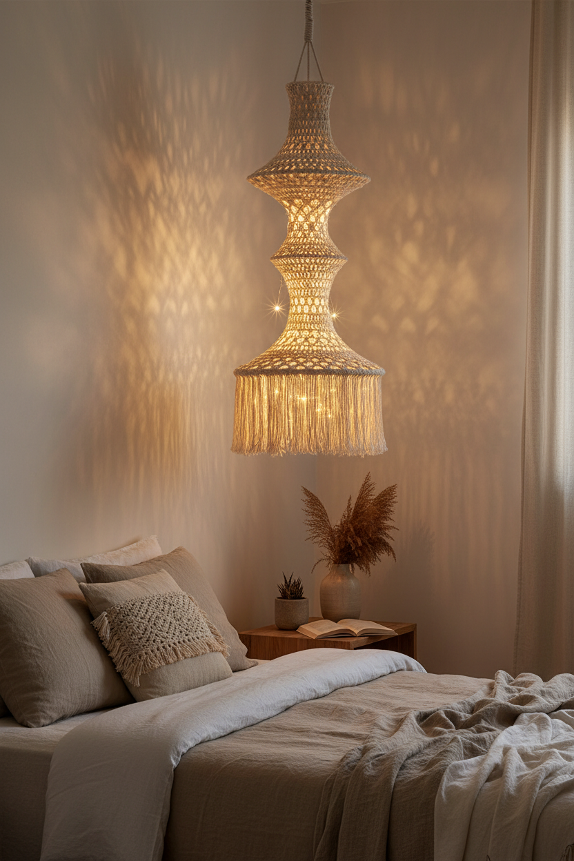 Handmade with artisanal care, this lamp combines the timeless elegance of crochet with the free spirit of boho style. The perforated patterns create delicate shadow plays on the walls, transforming any environment into a welcoming and evocative space.