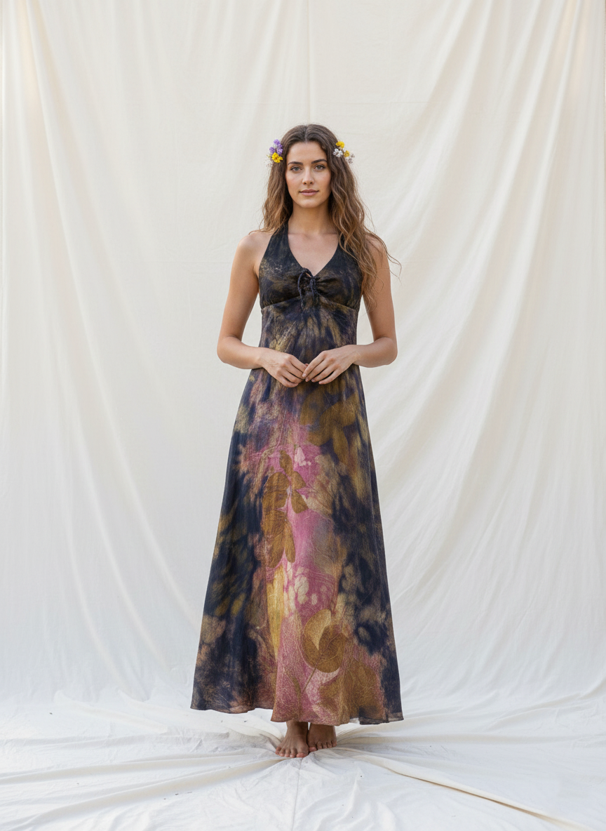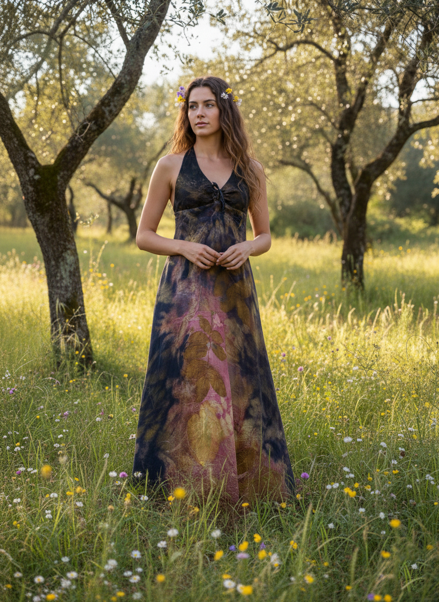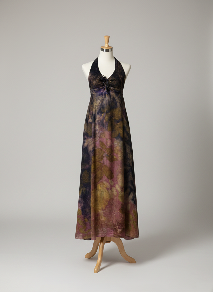 Long dress in hand-ecoprinted deadstock silk, born from a natural process that imprints the authentic traces of leaves and plant pigments on the fabric.