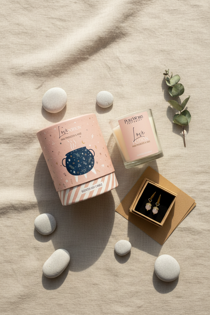 The scented candle Celestial Magic Love Potion with pink prosecco and rose fragrances envelops the spaces in a fragrant, warm, and cozy atmosphere, while the Astra earrings add a unique, elegant, and sparkling detail.