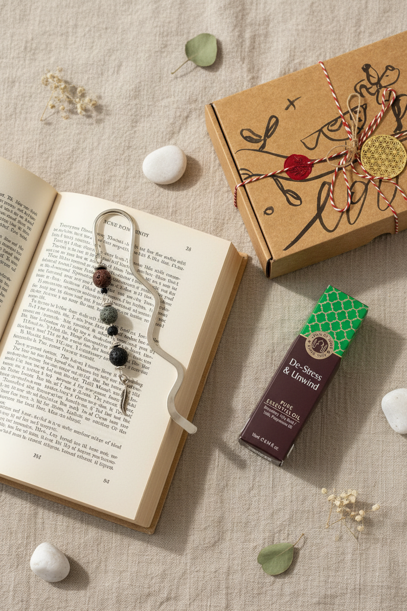 The aromatic silver bookmark glides between the pages while the aromatic oil spreads a trail of calm, and the decorated kraft pouch elegantly holds everything.