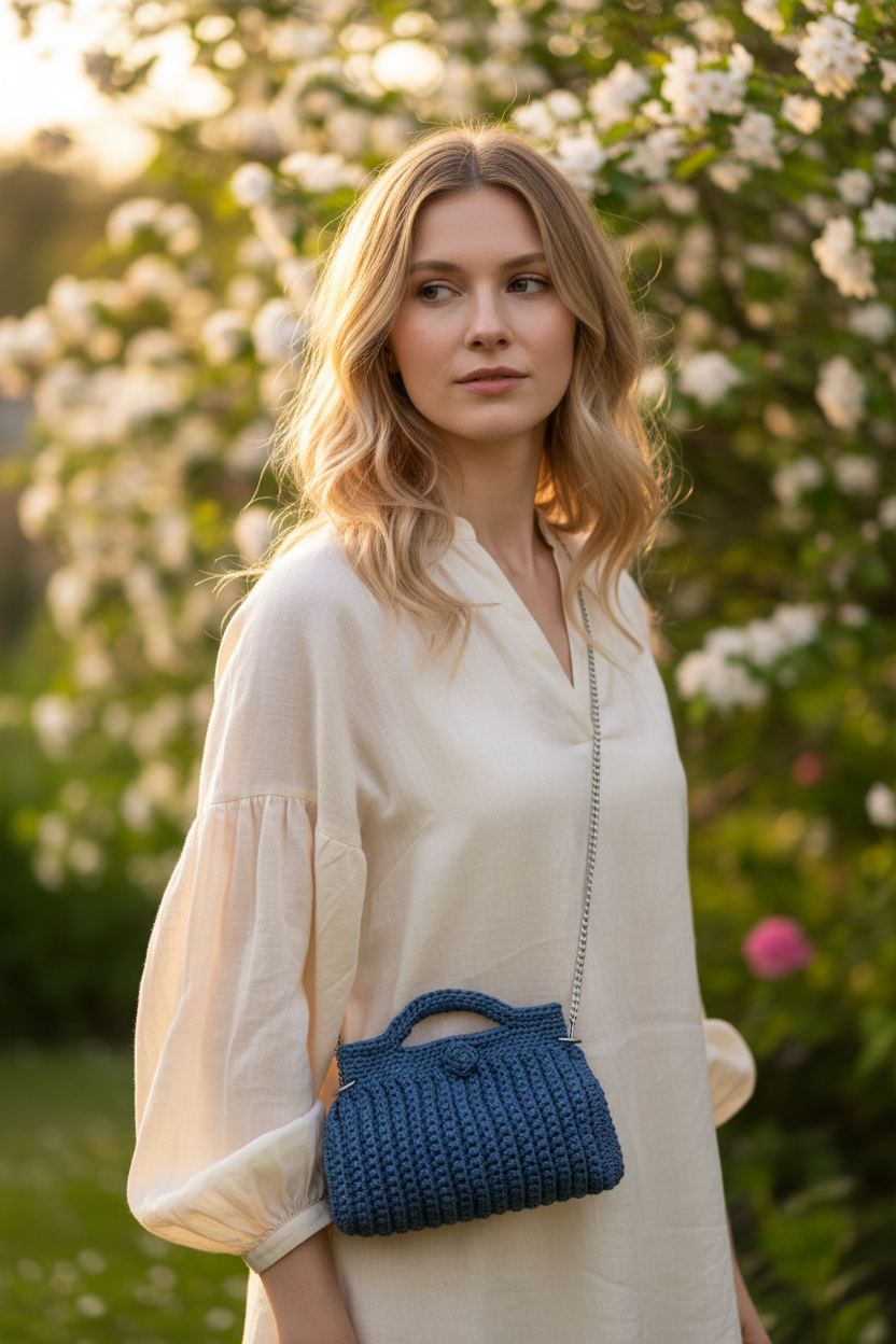 Una mini borsetta bauletto artigianale realizzata interamente all'uncinetto, che unisce tradizione e versatilità in un accessorio compatto e raffinato.